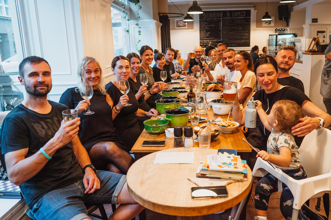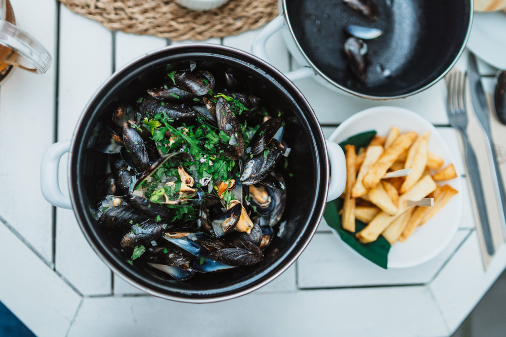 Moules - frites neboli slávky na bílém víně se šalotkou a bylinkami podávané s belgickými hranolky, pečivem a malým zeleninovým salátkem.
